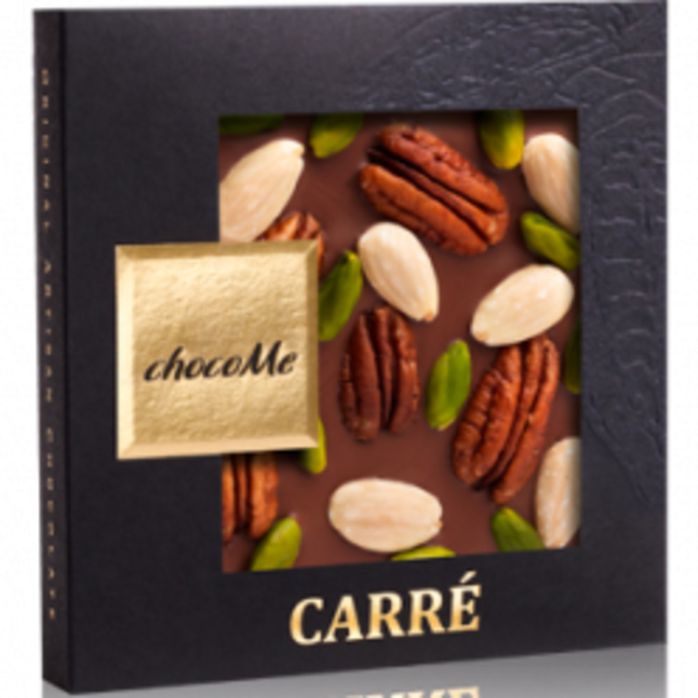 ChocoMe 50М104 - уникальный элитный шоколад ручной работы из серии шоколада с зернами. В состав входят следующие топинги: миндаль, фисташки Бронте, орехи пекан.